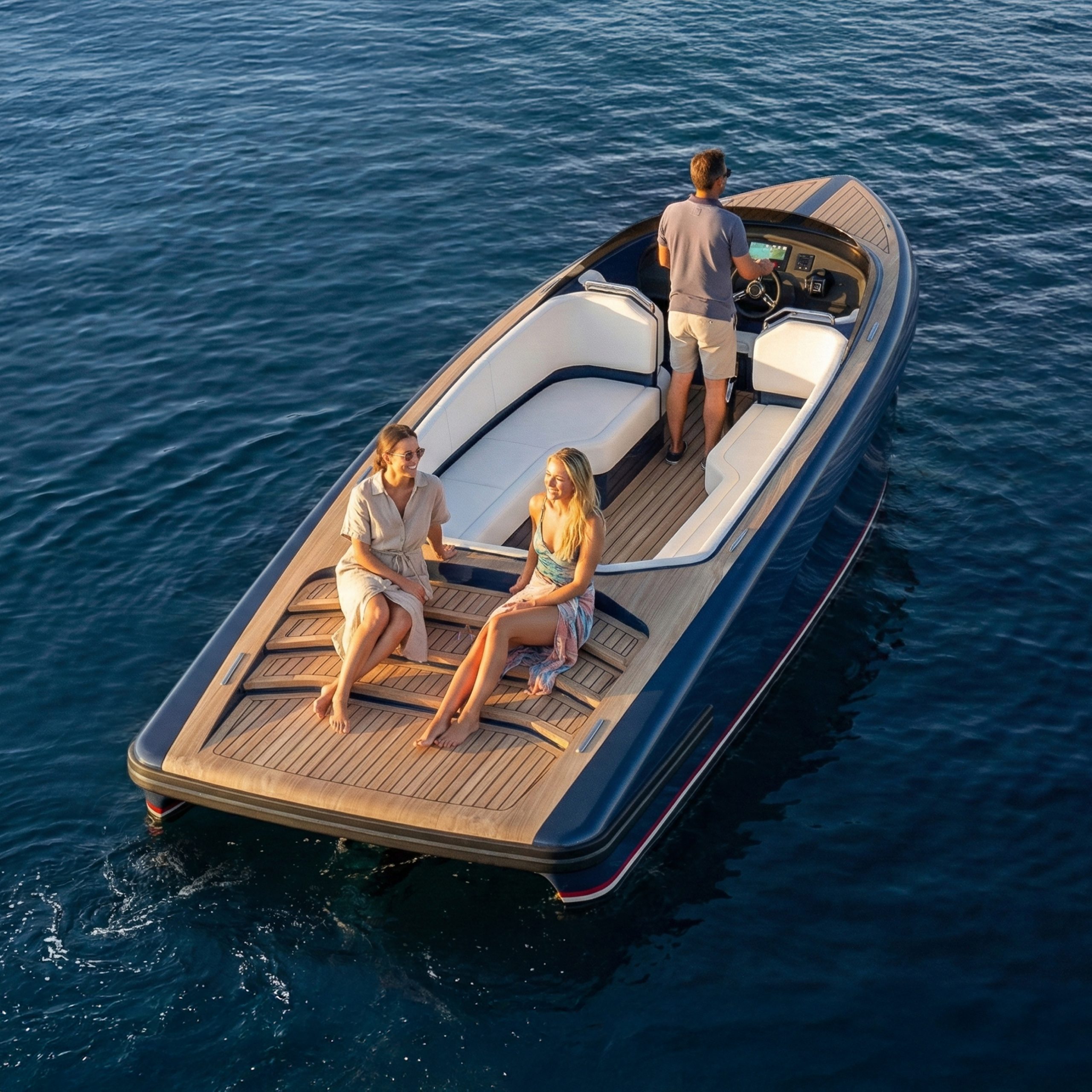 Conceived to deliver style and elegance in an efficient buildable package, it pairs the non-fussy sophistication of clean lines with the unassuming qualities of a modern day classic. A sportscar-inspired low stepped aft facilitates easy boarding, and seating for guests when underway. Reclaimed teak decking runs from the axe bow to the stern, with large interior storage located under the cockpit seating. A customisable console is paired with a fully bespoke exterior paint scheme and a signature interiors package.